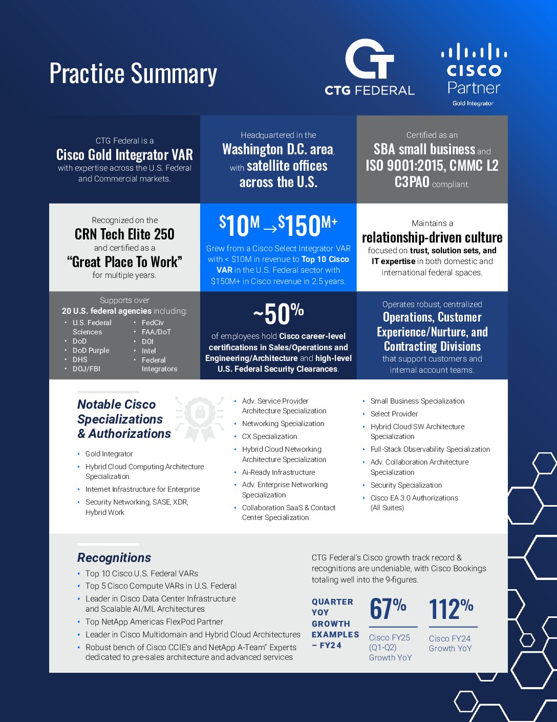 Cisco and CTG Federal partner closely together across the federal space, from sciences to defense and intelligence. We work in concert with Cisco to provide architectural solutions geared at delivering strategic digital transformation in direct alignment with Federal IT Modernization guidelines. CTG Federal excels in delivering industry-best architectures utilizing best of breed hardware, software, analytics, AI/ML, and professional services packaged together to offer agencies the turnkey solutions they require. CTG Federal’s investment in Cisco is evident, with nearly half of our employees possessing Cisco career certifications. We also possess advanced architecture specializations in a wide array of Cisco disciplines, SaaS structures, and sales operations skillsets. These demonstrate our unique capabilities across the Cisco spectrum. These include: